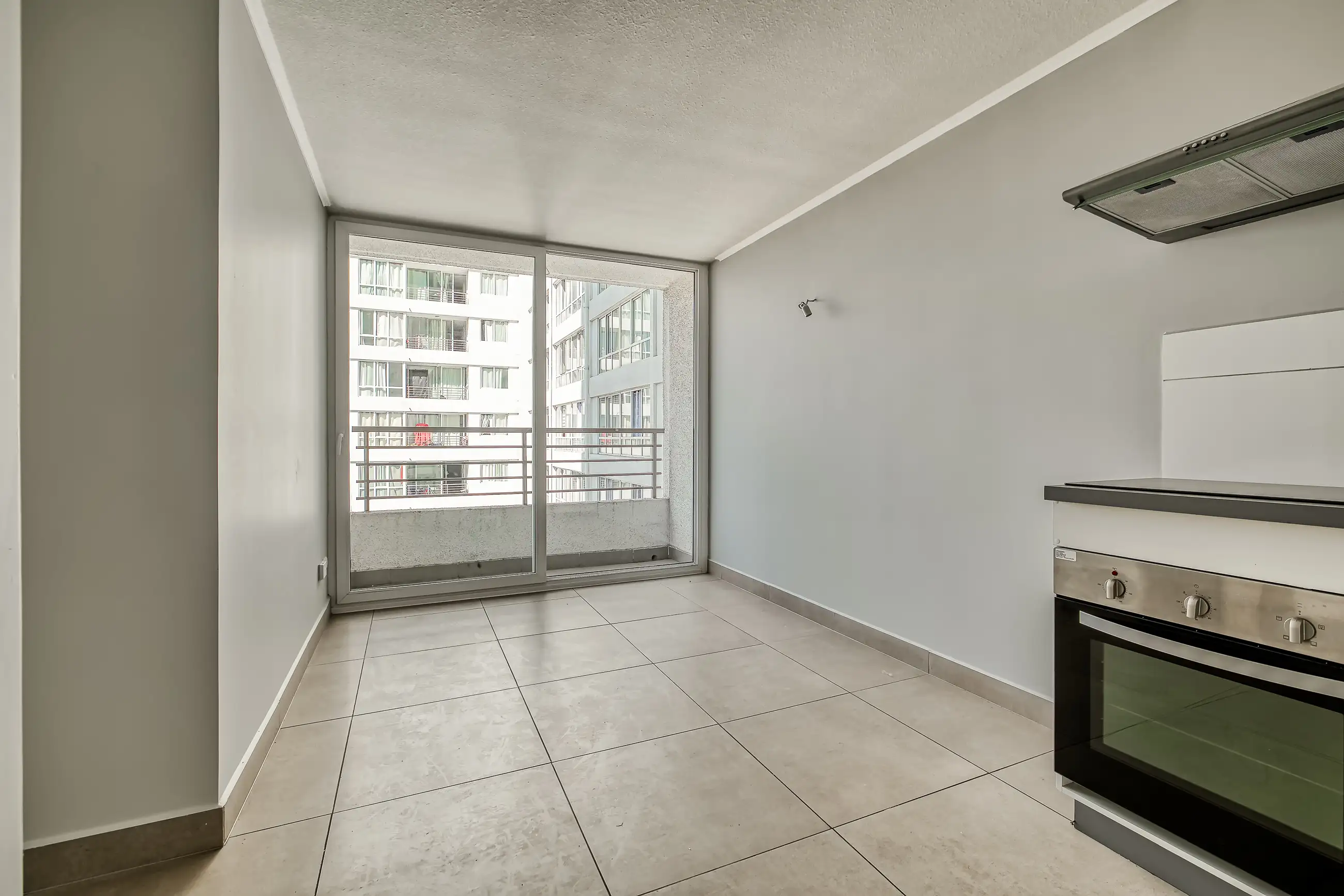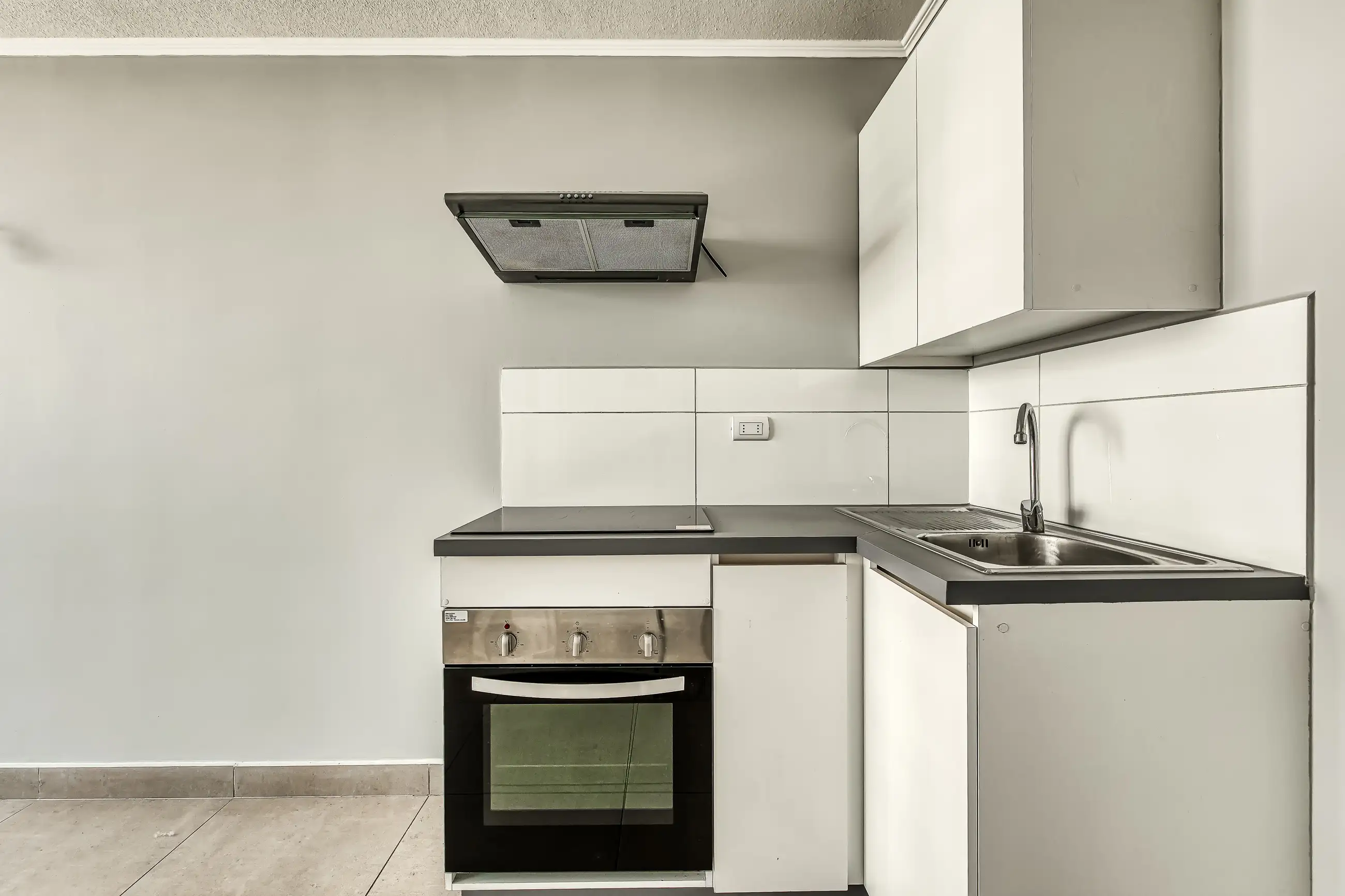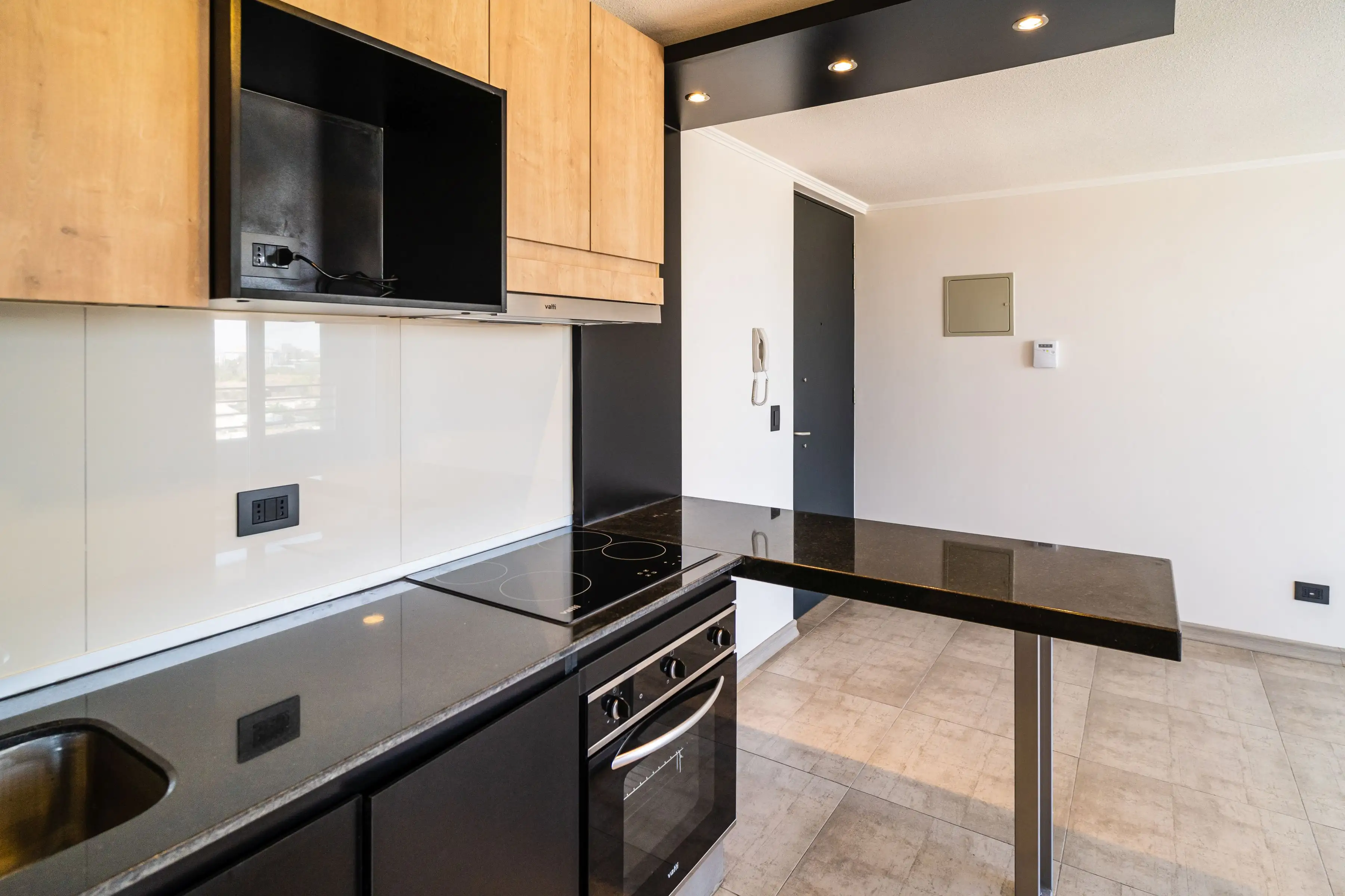 Cocina equipada con campana, horno eléctrico y encimera vitrocerámica.
