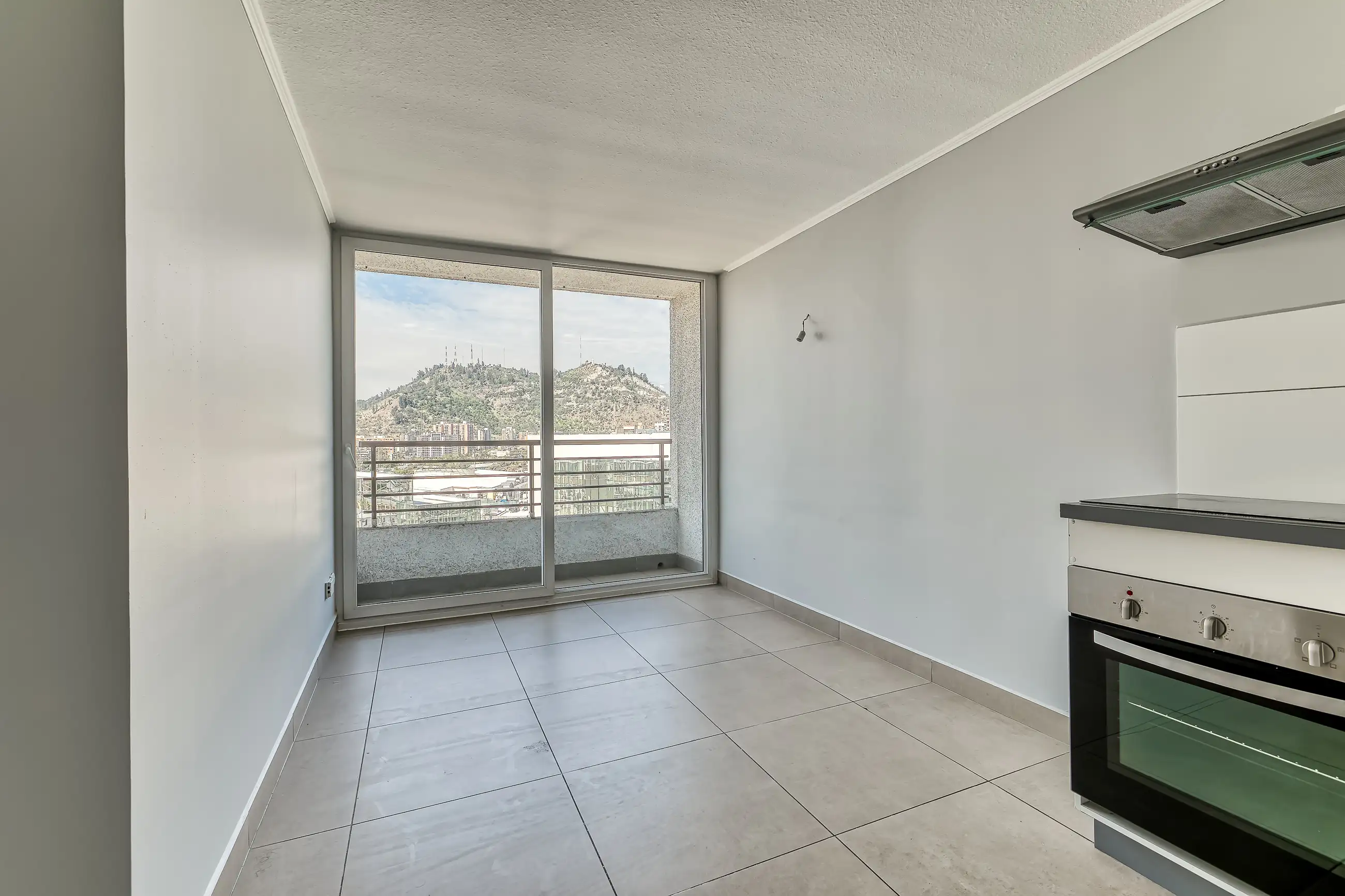 Cocina equipada con campana, horno eléctrico y encimera vitrocerámica.